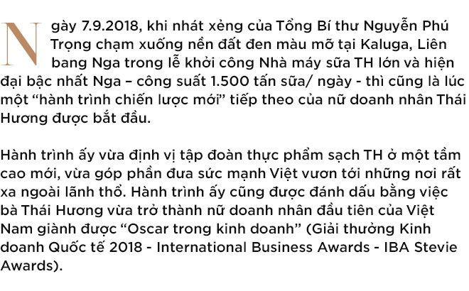 Hiện thực hóa ước mơ này, Thái Hương đã có một quyết định khiến cả giới đầu tư Việt và Nga xôn xao: Đầu tư dự án trang trại bò sữa khổng lồ tại Nga. Đó vừa là cách để bà tri ân nước Nga đã ở bên Việt Nam trong những tháng năm gian khó nhất, vừa là cú đánh chiến lược trên con đường lớn mang khát vọng “Việt Nam trở thành bếp ăn của thế giới” và “mang Việt Nam ra thế giới”.