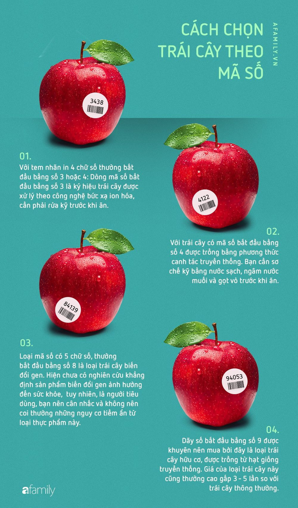 Thông thường, nếu dãy số bắt đầu bằng số 8, bạn nên cân nhắc trước khi mua vì đây là sản phẩm sử dụng công nghệ biến đổi gen... giúp trái cây có kích thước to hơn, màu sắc hấp dẫn hơn. Hiện chưa có nghiên cứu khẳng định sản phẩm biến đổi gen ảnh hưởng đến sức khỏe.