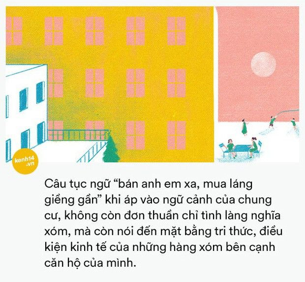 Vì vậy khi chọn mua chung cư, dự kiến những người sống cùng với mình nằm trong tầng lớp nào cũng là điều quan trọng. Việc này sẽ thường được phân loại dựa trên giá cả của chung cư. Vì thế, câu tục ngữ “bán anh em xa, mua láng giềng gần” khi áp vào ngữ cảnh của chung cư, không còn đơn thuần chỉ tình làng nghĩa xóm, mà còn nói đến mặt bằng tri thức, điều kiện kinh tế của những hàng xóm bên cạnh căn hộ của mình.