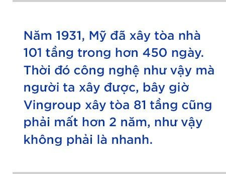 Ông Phạm Nhật Vượng đã đưa ra một so sánh bất ngờ: “Năm 1931, Mỹ đã xây tòa nhà 101 tầng trong hơn 450 ngày. Thời đó công nghệ như vậy mà người ta xây được, bây giờ Vingroup xây tòa 81 tầng cũng phải mất hơn 2 năm, như vậy không phải là nhanh”.