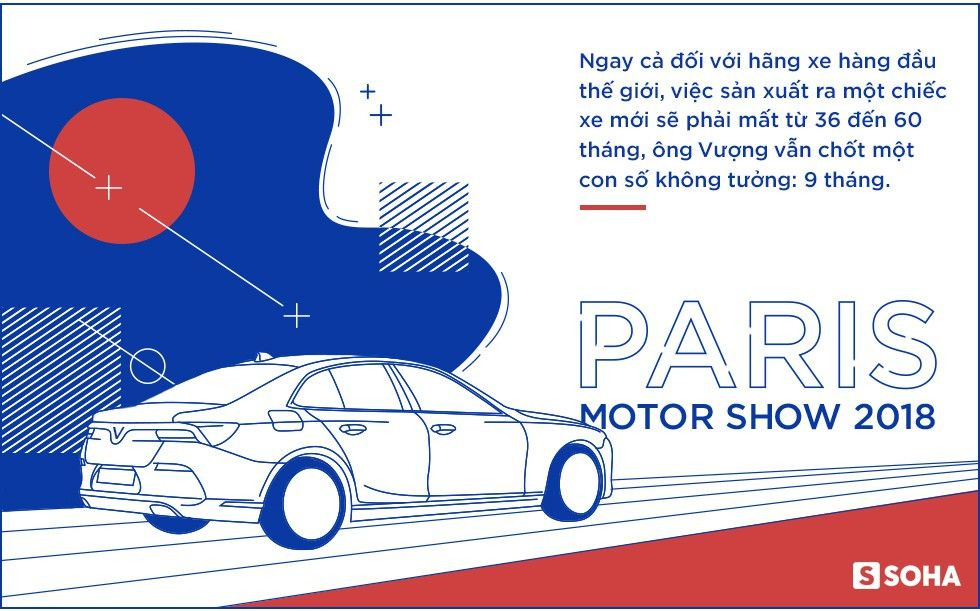 Ông James B.DeLuca cùng cộng sự chỉ có quỹ thời gian là 9 tháng để ra lò chiếc xe đầu tiên dự triển lãm tại Paris, dù ông đã trình bày với ông Vượng rằng ngay cả đối với các hãng hàng đầu thế giới, việc sản xuất ra một chiếc ô tô mới, phải sẽ phải mất từ 36 đến 60 tháng.