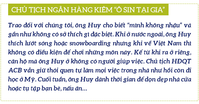 Khi mới làm Chủ tịch HĐQT, ông Huy "nói tiếng Việt còn chưa sõi" như cách nói vui của một lãnh đạo kỳ cựu ACB. Trên thực tế, điều này đúng cả nghĩa bóng (ông Huy mới là người "nhận nhiệm vụ"), lẫn nghĩa đen (do sống và làm việc ở nước ngoài nhiều năm, ông Huy hay nói tiếng Anh xen lẫn tiếng Việt khi diễn đạt).