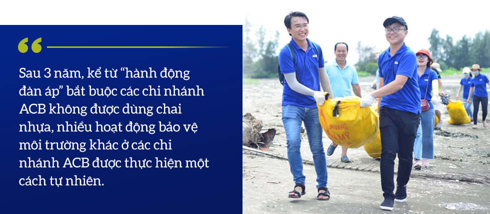 Chưa hết, khi thực hiện một cuộc khảo sát tại ACB, chỉ có 6% người được hỏi quan tâm đến biện pháp bảo vệ môi trường do Chủ tịch HĐQT phát động. Thế nhưng, ông Huy rất kiên trì. Vị lãnh đạo này liên tục tổ chức tuyên truyền thông tin trong nội bộ về tác dụng của việc không dùng chai nhựa một lần…Ba tháng sau, tỷ lệ quan tâm khi khảo sát lại lên tới 70%.