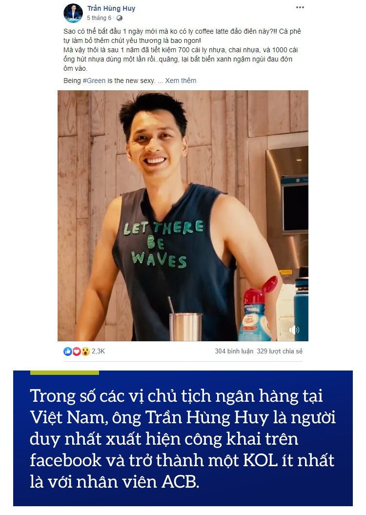 Trong số các vị chủ tịch ngân hàng tại Việt Nam, ông Huy là người duy nhất xuất hiện công khai trên facebook và trở thành một KOL ít nhất là với nhân viên ACB. Tuy nhiên, vị chủ tịch ngân hàng trẻ nhất Việt Nam vẫn giữ các nguyên tắc về sự thận trọng trong từng con chữ và chỉ chia sẻ hình ảnh gia đình cũng như thông tin về "gia đình ACB".