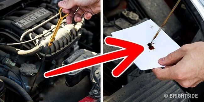 Kiểm tra chất lượng dầu: Đây là một mẹo đặc biệt giúp ta kiểm tra được chất lượng dầu trong động cơ. Làm nóng động cơ từ 5-10 phút, sau đó tắt bộ đánh lửa. Mở mui xe và nhỏ vài giọt dầu vào giấy. Đặt tờ giấy ở nơi thoáng mát và chờ khoảng 2 giờ đến khi giọt dầu khô hẳn. Sau đó, kiểm tra kết quả. Nếu xung quanh chấm tròn đều trơn tru, có nghĩa dầu không bị pha lẫn nước. Đây là dầu tốt. Còn nếu giữa chấm tròn có màu đen (xám) thì dầu bị bẩn, cần phải thay. Nếu trên tờ giấy có lẫn các mẫu vụn kim loại chứng tỏ vài bộ phận trong xe bị hỏng. Ta đang dùng dầu kém chất lượng. Cần phải thay dầu mới.