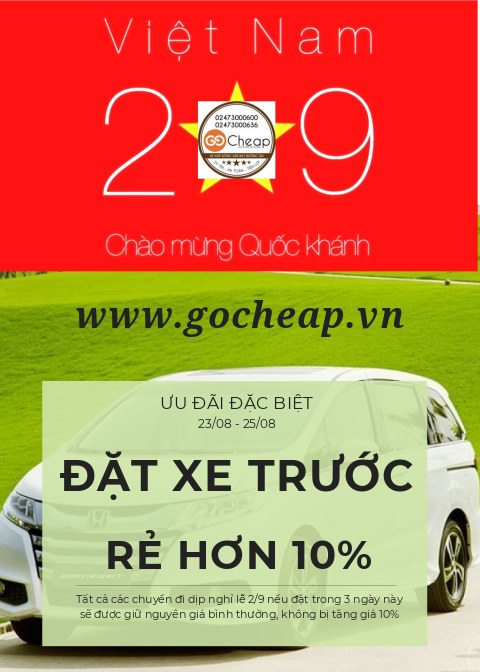 Nhân dịp lễ quốc khánh Việt Nam 2018, dịp 2/9 Gocheap.VN triển khai chương trình "Đặt xe sớm - Giá không tăng" giúp khách hàng được đặt trước các chuyến đi sân bay Nội Bài, đường dài với giá không đổi
