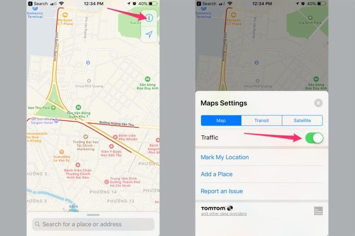 Để sử dụng tính năng này trên Apple Maps, bạn chỉ việc mở ứng dụng Maps (với tiếng việt là “Bản đồ”) – sau đó bấm vào nút ! bên góc trên và gạt nút Traffic (với tiếng việt là “Giao thông”). Khi bật tính năng này, bạn sẽ thấy những đường kẻ màu trên đường thể hiện tình trạng giao thông. Đối với màu vàng là mật độ xe đang khá đông nhưng vẫn đi được, màu đỏ là hoàn toàn kẹt cứng.