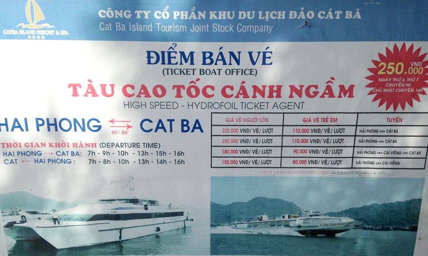 Có rất nhiều cách để đi ra đảo Cát Bà. Hai đường chính là từ Hải Phòng và Hạ Long. Có hai phương tiện phổ biến ra đảo là tàu cao tốc và phà. 1/ Đi tàu cao tốc từ Hải Phòng Bạn có thể đi tàu cao tốc từ bến Bính, giá vé khoảng 200k - 220k/người, tàu chạy 50’ là đến. Ưu điểm gần trung tâm thành phố, tiện di chuyển, nhưng giá vé cao. Bạn có thể đặt vé của Mekong Hoàng Yến hoặc Cát Bà Island Resort. Tàu cập cảng tại trung tâm thị trấn Cát Bà đối diện quảng trường trên đường 1/4.