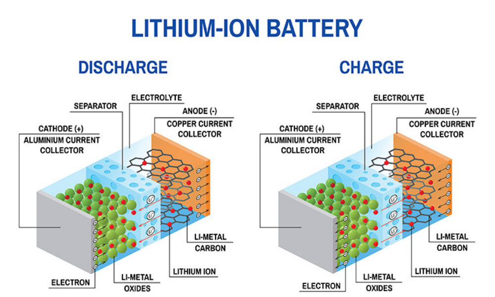 Pin Lithium-ion gồm 2 cực: Cực dương sử dụng hợp chất oxit kim loại chuyển tiếp (Mn, Co, Ni) cùng với Liti (hợp kim Lithium (nguyên tố Liti với kí hiệu hóa học Li); cực âm dùng Graphite và sử dụng chất điện li dạng lỏng.